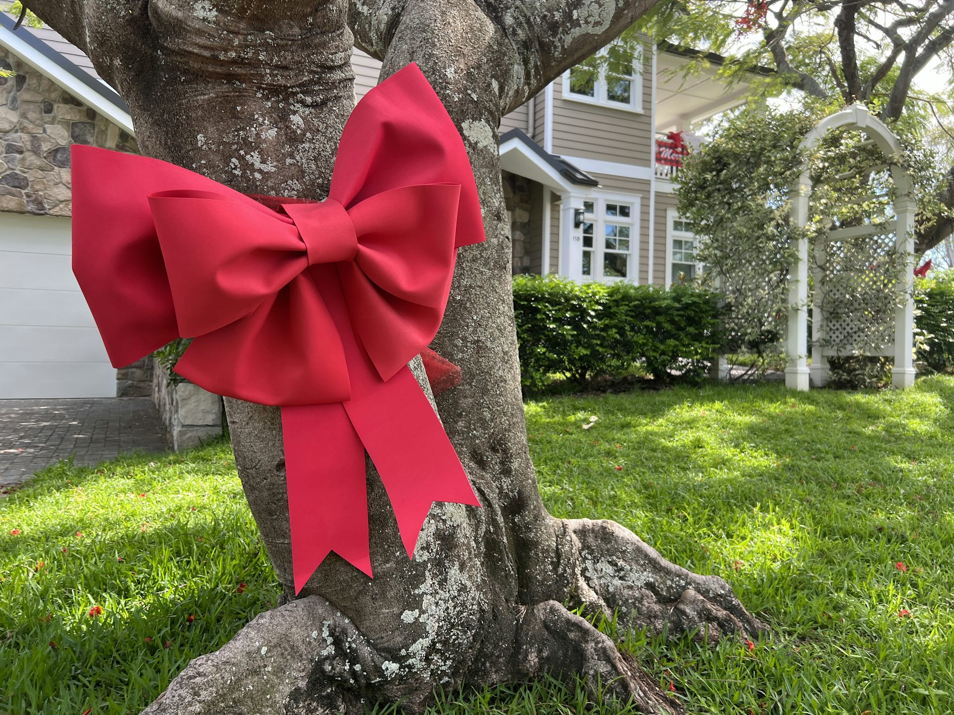 - Switch to daytime decorations such as big red bows on trees. Better still, plant a garden with festive colour. Bottlebrush, woolly bush, Christmas bush and Christmas bells are all gorgeous native Australian plants that bloom brightly over Christmas.